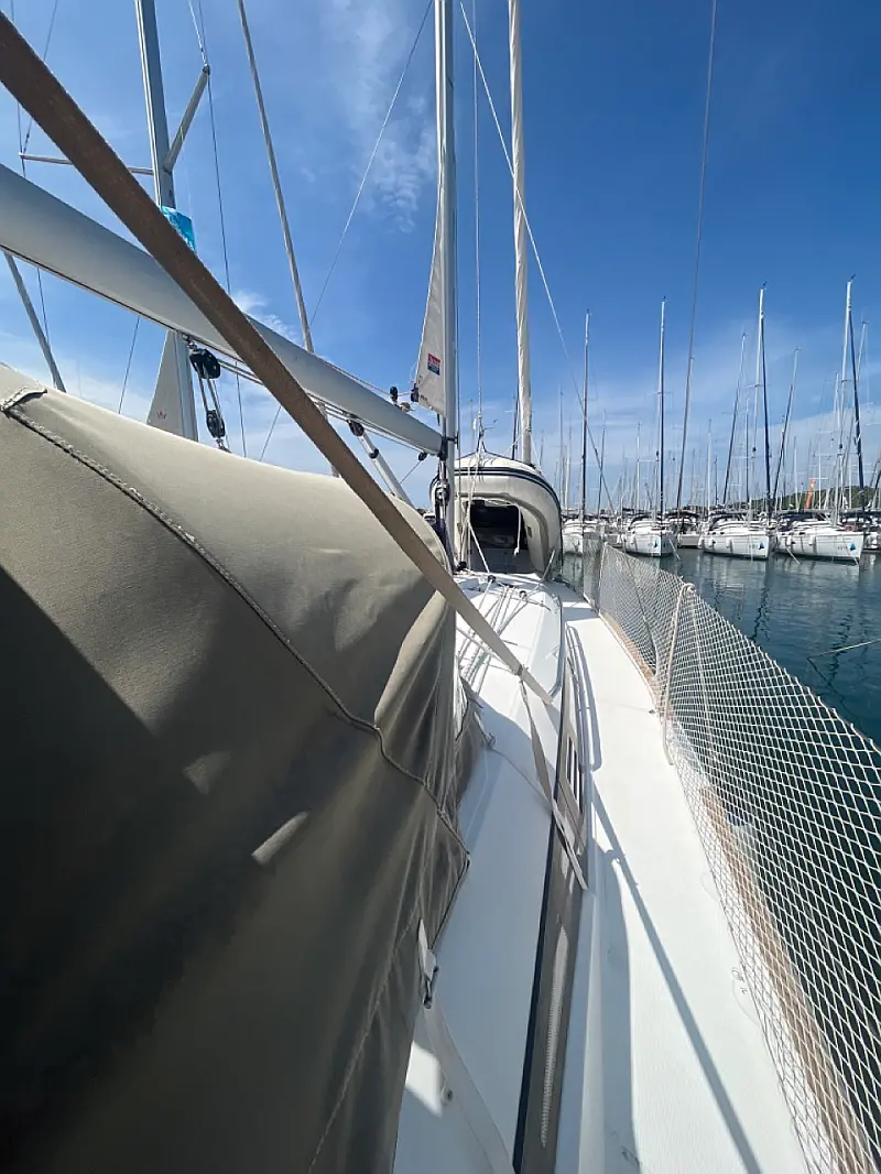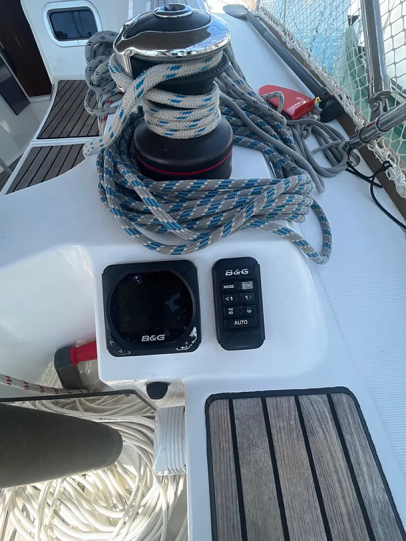 Tender, Bimini top, Sprayhood, Hot water, Cockpit table, Roll main sail, Roll Genoa, Autopilot, Echo sounder, Speed log, VHF, Radio CD player, Electric windlass, Wind instrument, Winch handles (2), Anchor with chain (2), Fenders (6), Gas bottle (2), Ropes, Boat hook, Wind direction indicator, Byboat pump (true), Water hose, Brush (true), Bilge pump + handle, Charts, Plotters + dividers, Hand bearing compass, Binoculars, Pilot books, Life jackets, First aid kit, Portable lamp, Tools, Clock, Barometer, Kitchen equipment, Life buoy, GPS + CHART PLOTTER IN COCKPIT, Solar panels, Blue underwater lights, Bed linen