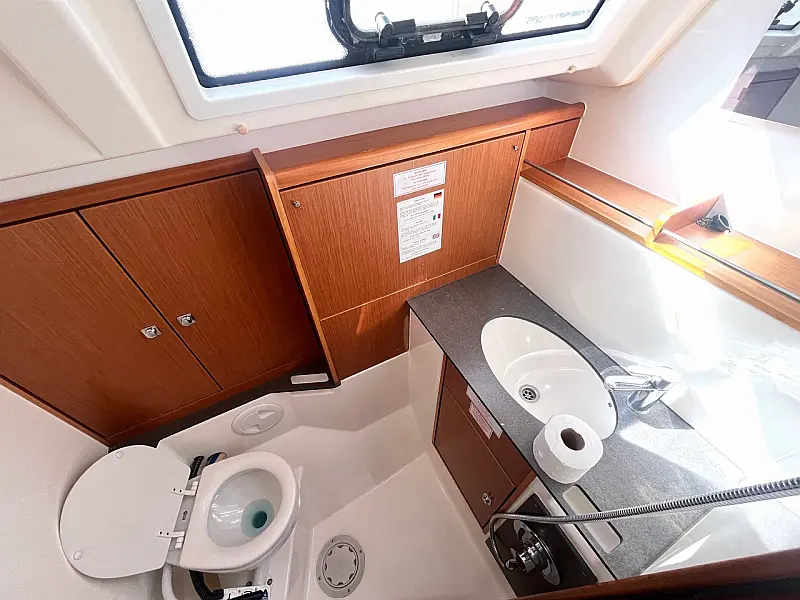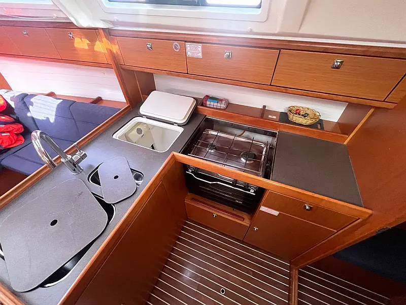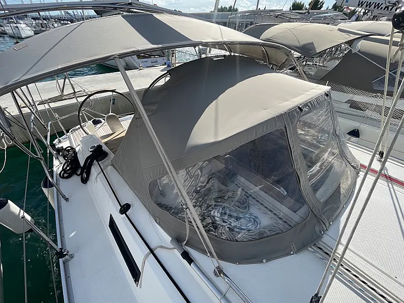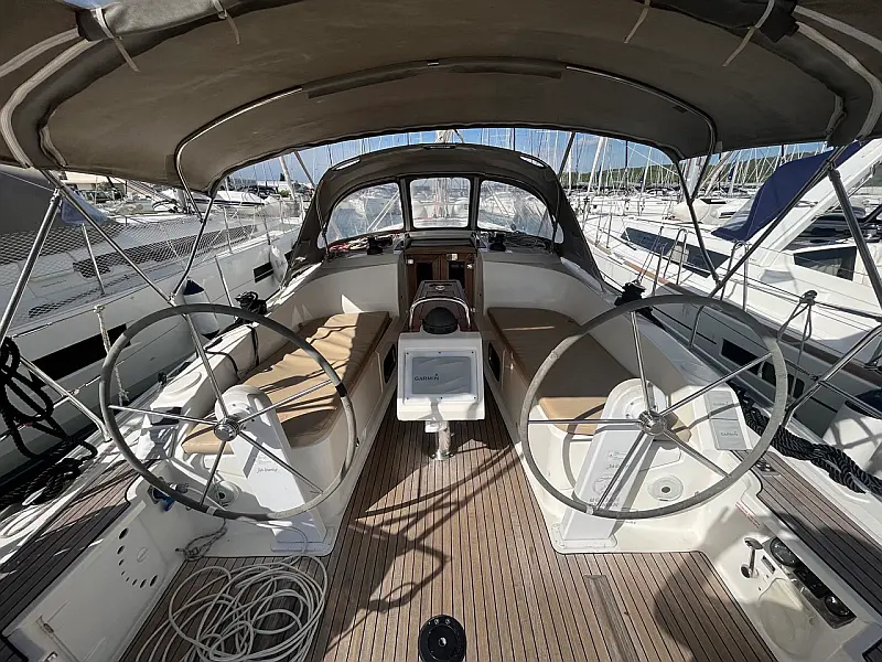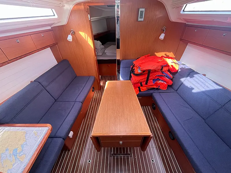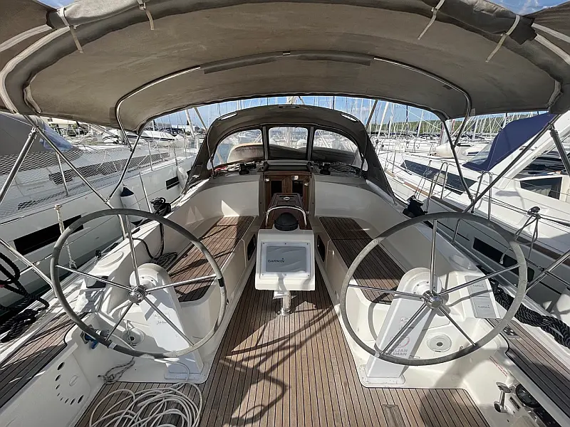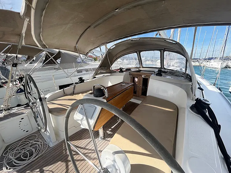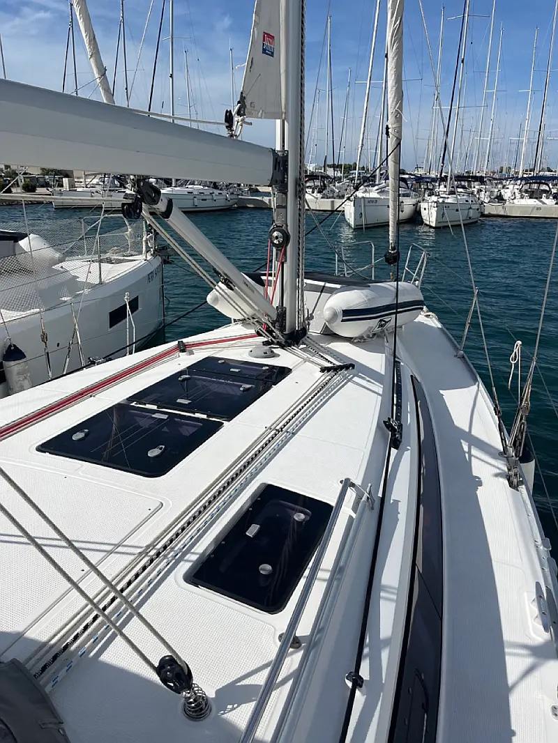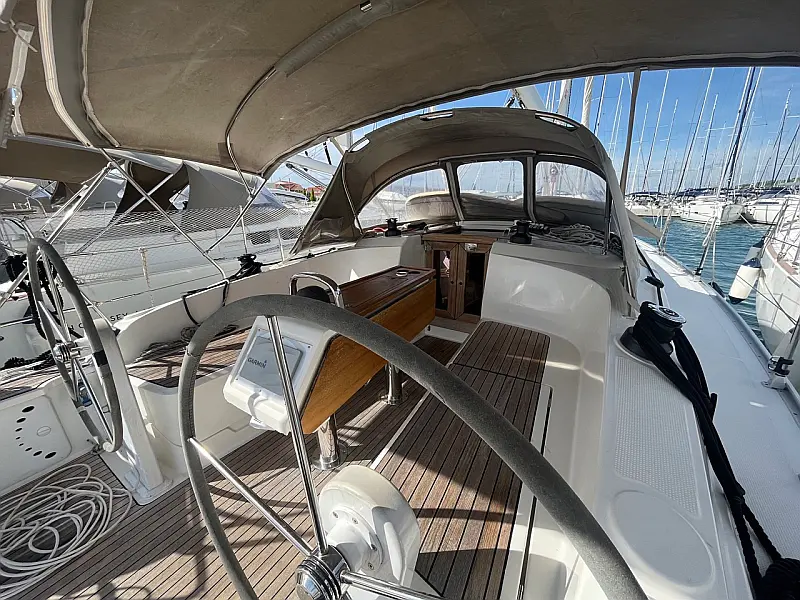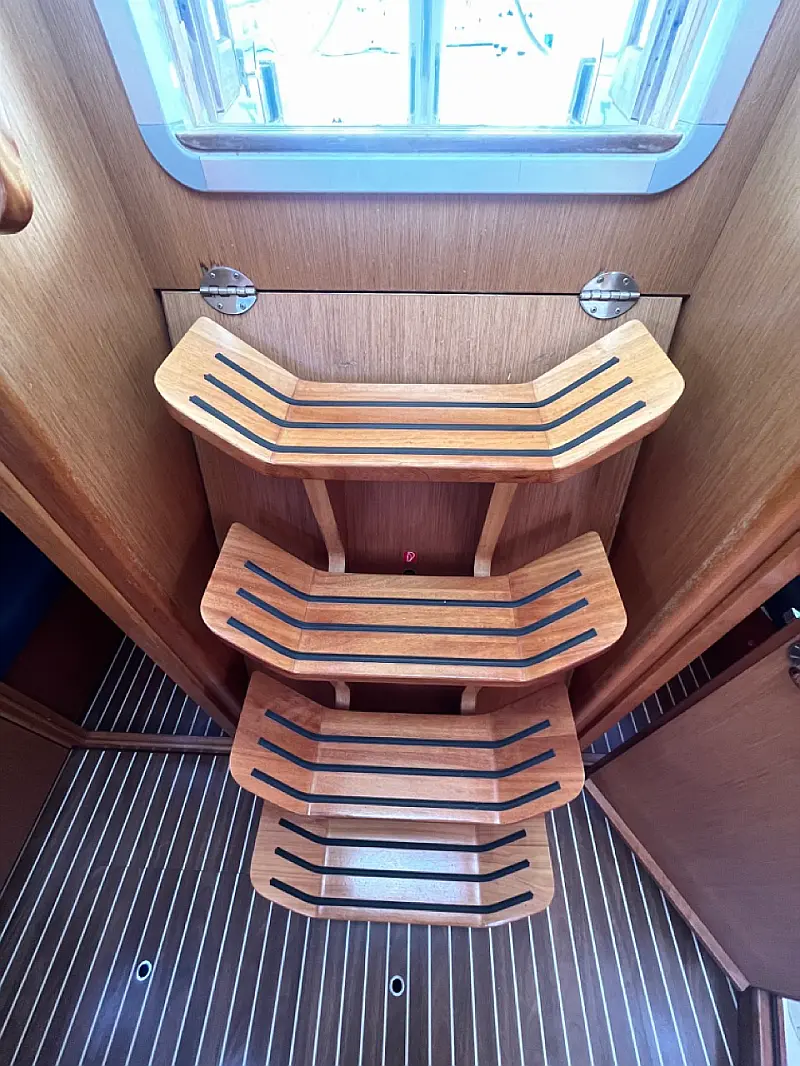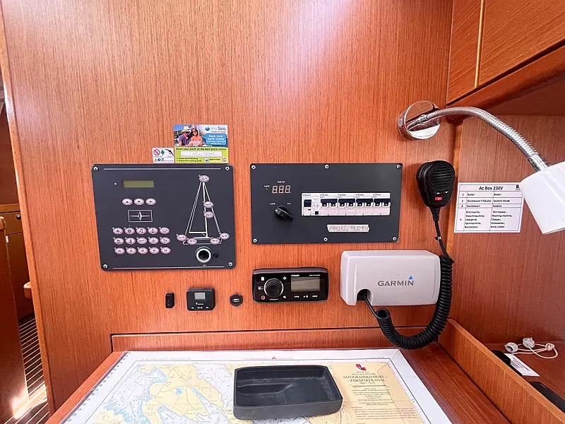 Tender, Bimini top, Sprayhood, Bow thruster, Heating, Hot water, Cockpit table, Roll main sail, Roll Genoa, Autopilot, Echo sounder, Speed log, VHF, Radio CD player, Electric windlass, Wind instrument, Winch handles (2), Anchor with chain (2), Fenders (6), Gas bottle (2), Ropes, Boat hook, Wind direction indicator, Byboat pump (true), Water hose, Brush (true), Bilge pump + handle, Charts, Plotters + dividers, Hand bearing compass, Binoculars, Pilot books, Life jackets, First aid kit, Portable lamp, Tools, Clock, Barometer, Kitchen equipment, Life buoy, GPS + CHART PLOTTER IN COCKPIT, Solar panels, Blue underwater lights, Bed linen