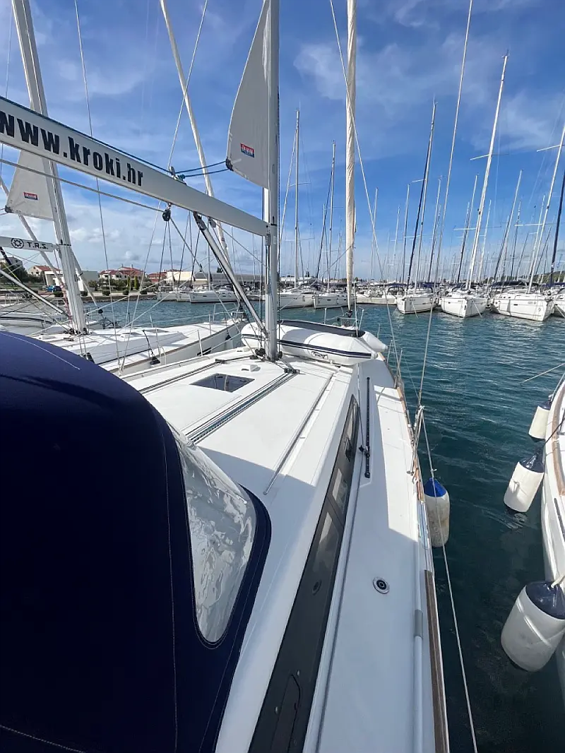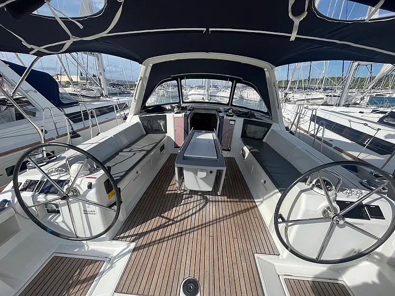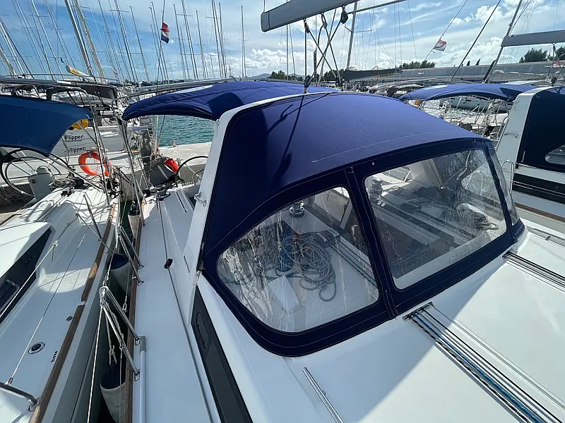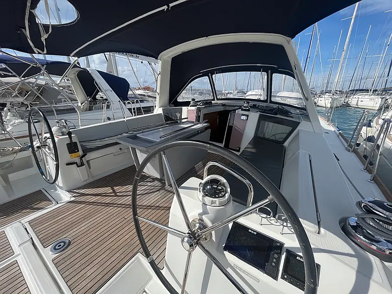 Cockpit cushions Tender, Bimini top, Sprayhood, Bow thruster, Heating, Hot water, Cockpit table, Roll main sail, Roll Genoa, Autopilot, Echo sounder, Speed log, VHF, Electric windlass, Wind instrument, Winch handles (2), Anchor with chain (2), Fenders (6), Gas bottle (2), Ropes, Boat hook, Wind direction indicator, Byboat pump (true), Water hose, Brush (true), Bilge pump + handle, Charts, Plotters + dividers, Binoculars, Life jackets, First aid kit, Portable lamp, Tools, Clock, Barometer, Kitchen equipment, Life buoy, GPS + CHART PLOTTER IN COCKPIT, Solar panels, Blue underwater lights, Bed linen