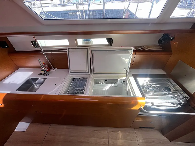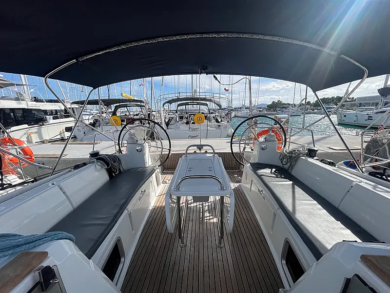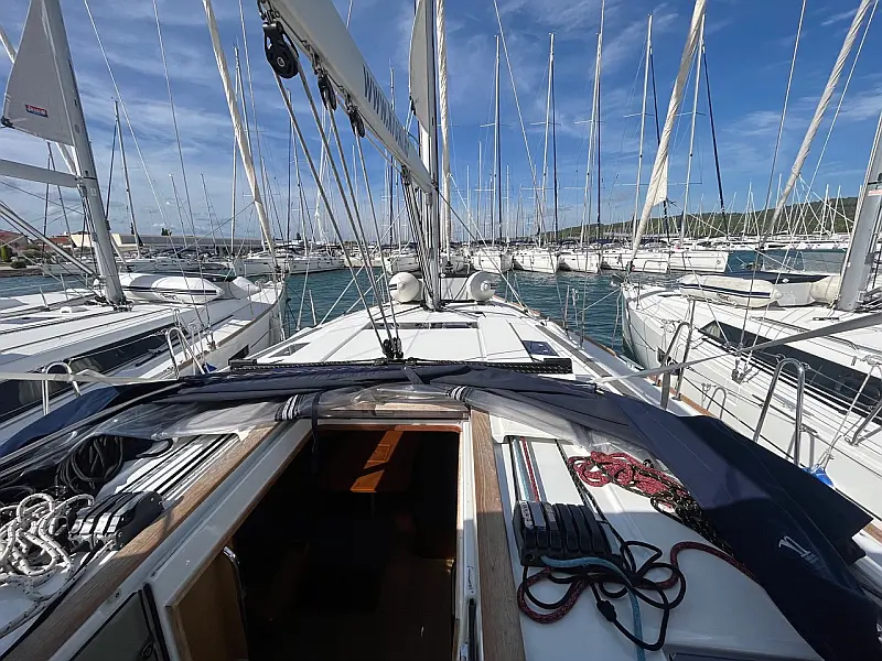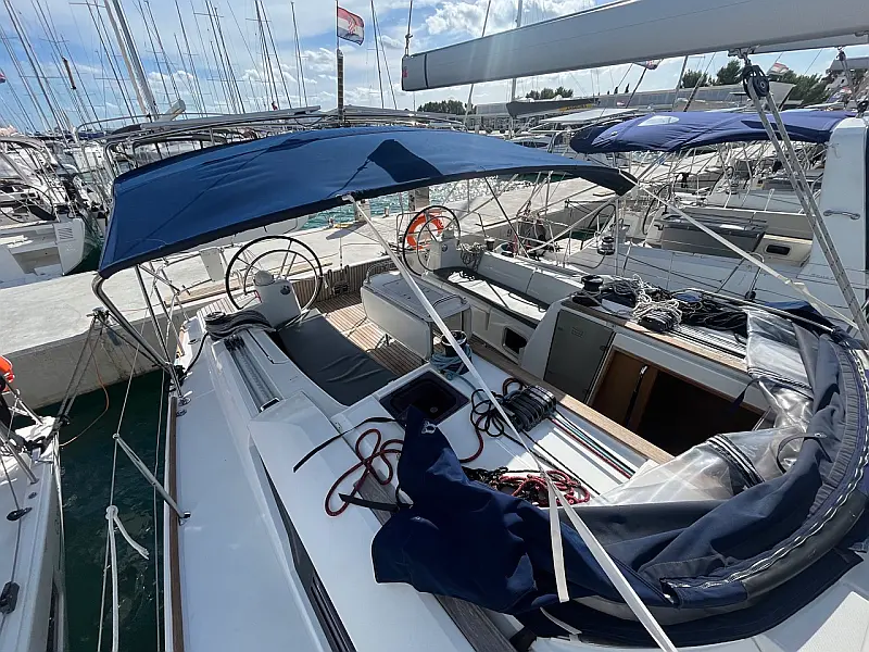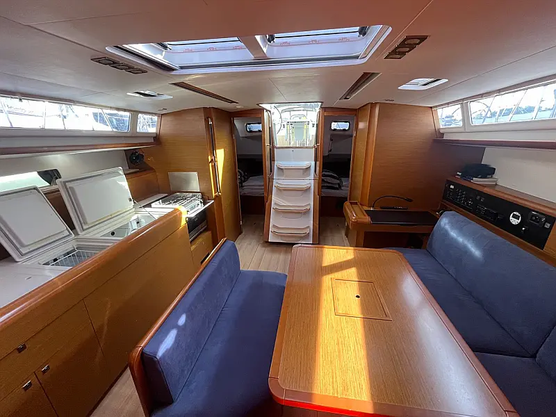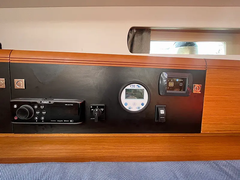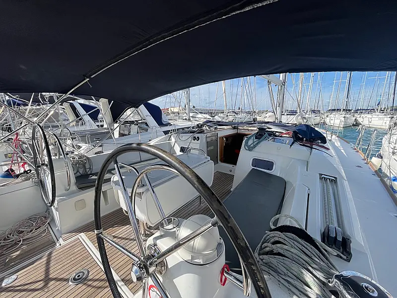 Tender, Bimini top, Sprayhood, Bow thruster, Heating, Hot water, Cockpit table, Roll main sail, Roll Genoa, Autopilot, Echo sounder, Radio CD player, Wind instrument, Gas bottle (1), Ropes, Boat hook, Byboat pump (true), Brush (true), Bilge pump + handle, Charts, Plotters + dividers, Hand bearing compass, Binoculars, Pilot books, Life jackets, First aid kit, Portable lamp, Clock, Barometer, Kitchen equipment, Generator, Air conditioning, Life buoy, Electrical fridge, Teak cockpit, Cockpit speakers, Bowsprit (true), Engine (Yanmar 57 HP), GPS + CHART PLOTTER IN COCKPIT, Solar panels, Blue underwater lights, Bed linen